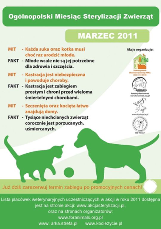 (powiat zawierciański) Trwają przygotowania do akcji „Marzec 2011 - Ogólnopolski Miesiąc Sterylizacji Zwierząt”. W ramach akcji w wybranych gabinetach weterynaryjnych będzie można wysterylizować, bądź wykastrować swojego pupila nawet o połowę taniej.