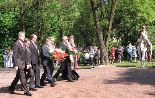 Uroczystości z okazji uchwalenia Konstytucji 3 Maja zawsze gromadzą przy Pomniku Nieznanego Żołnierza patriotów i osoby kochające ojczyznę. Tegoroczną ceremonię rozpoczął uroczysty przemarsz pocztów sztandarowych i Jurajskiego Szwadronu Kawalerii im. Króla Jana III Sobieskiego z Poręby w barwach XX Pułku Ułanów dowodzony przez porucznika Marka Pałuchę. Prezydent Ryszard Mach z przewodniczącym Rady Miejskiej Edmundem Kłóskiem na uroczystości przybyli bryczką. W majestatycznym stylu wraz z głównodowodzącymi miasta na Plac T. Stosika przyjechali także starosta powiatu zawierciańskiego Rafał Krupa oraz poseł Piotr van der Coghen. W obchodach wzięli także udział: zastępcy prezydenta miasta Marek Kozieł i Wojciech Mikuła, poseł na sejm RP Anna Nemś, radni Sejmiku Województwa Śląskiego Witold Grim oraz Marian Gajda, miejscy i powiatowi radni, oraz przedstawiciele: Komendy Powiatowej Państwowej Straży Pożarnej w Zawierciu, Komendy Powiatowej Policji w Zawierciu, Związków Kombatantów, Hufca Ziemi Zawierciańskiej, powiatowych jednostek Pomocy Społecznej, zawierciańskiej służby zdrowia, Zakładu Komunikacji Miejskiej, Cechu Rzemiosł Małych i Średnich Przedsiębiorców, Zakładu Gospodarki Mieszkaniowej, Zakładu Gospodarki Komunalnej, Zawierciańskiego Uniwersytetu Trzeciego Wieku, Miejskiego Ośrodka Kultury „Centrum”, Miejskiej i Powiatowej Biblioteki Publicznej, Związku Nauczycielstwa Polskiego w Zawierciu oraz placówek edukacyjnych. Po uroczystości ks. Zenon Gajda w Bazylice Mniejszej Świętych Apostołów Piotra i Pawła w Zawierciu odprawił mszę św. w intencji ojczyzny. (JB)