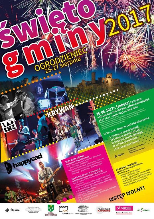 (Ogrodzieniec) W najbliższy weekend gmina Ogrodzieniec będzie obchodzić swe święto. Obchody połączone będą z Pożegnaniem lata na Birowie i Zamku Ogrodzieniec. Uczestnicy trzydniowej imprezy nie będą mogli narzekać na nudę, bowiem prócz występów lokalnych kapel i zespołów mieszkańcy mogą liczyć m.in. na wieczór taneczny, niecodzienne zabawy dla całej rodziny oraz koncerty zespołów znanych w całej Polsce, tj. Happysad i Lao Che.
