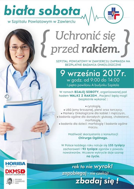 Już jutro (9 września) w zawierciańskiej lecznicy zorganizowana zostanie Biała Sobota pod hasłem „Uchronić się przed rakiem”. Szpital Powiatowy w Zawierciu zaprasza wszystkich chętnych na wykonanie szeregu bezpłatnych badań – m.in. cytologii, badań ogólnych dla dzieci oraz dla dorosłych, USG jamy brzusznej, piersi i tarczycy, markerów onkologicznych dla kobiet i mężczyzn.