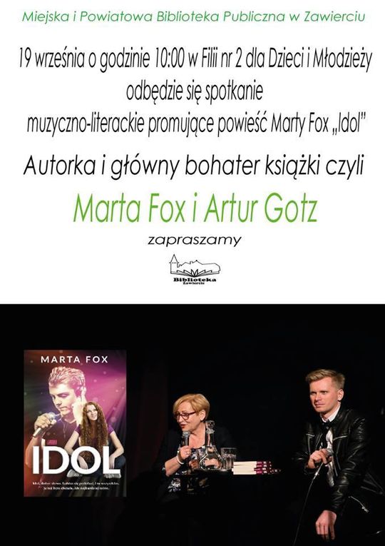 We wtorek 19 września o 10.00 w Filii nr 2 dla Dzieci i Młodzieży odbędzie się spotkanie muzyczno-literackie promujące powieść Marty Fox „Idol”. W spotkaniu uczestniczyć będą autorka powieści oraz jej główny bohater, czyli Marta Fox i Artur Gotz.