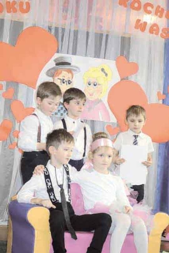 Przedszkolaki zaprezentowały swoje umiejętności na scenie. Zgromadzeni goście wysłuchali wierszy i piosenek oraz obejrzeli tańce z lat 70-tych. Dzieci przedstawiły w specjalnej scence perypetie babć i dziadków od lat młodzieńczych, po czas ślubu i lata współczesne. Kolejną niespodzianką, która zachwyciła wszystkich był taniec chłopców przebranych za babuleńki. Na koniec Leśne Duszki odśpiewały najbliższym 100 lat i wręczyły własnoręcznie przygotowane upominki. Po występach dzieci można było liczyć na słodki poczęstunek. Wspaniałą uroczystość przygotowały nauczycielki Ilona Mach i Sylwia Pilis-Franczyk. (mpp)