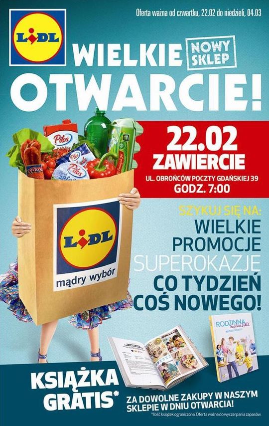 (Zawiercie) Już jutro – w czwartek 22 lutego – o godzinie 7:00 otwarty zostanie nowy market sieci Lidl przy ul. Obrońców Poczty Gdańskiej 39. Spółka zachęca klientów do wybrania się w najbliższych dniach na zakupy do nowo otwartego sklepu. W dniu otwarcia na tych, którzy zrobią tam zakupy czekać ma upominek w postaci książki kucharskiej. Zaplanowano też inne atrakcje – klienci będą mogli poczęstować się m.in. aromatyczną kawą, croissantami, potrawami z grilla. Przygotowano także niespodzianki dla dzieci.