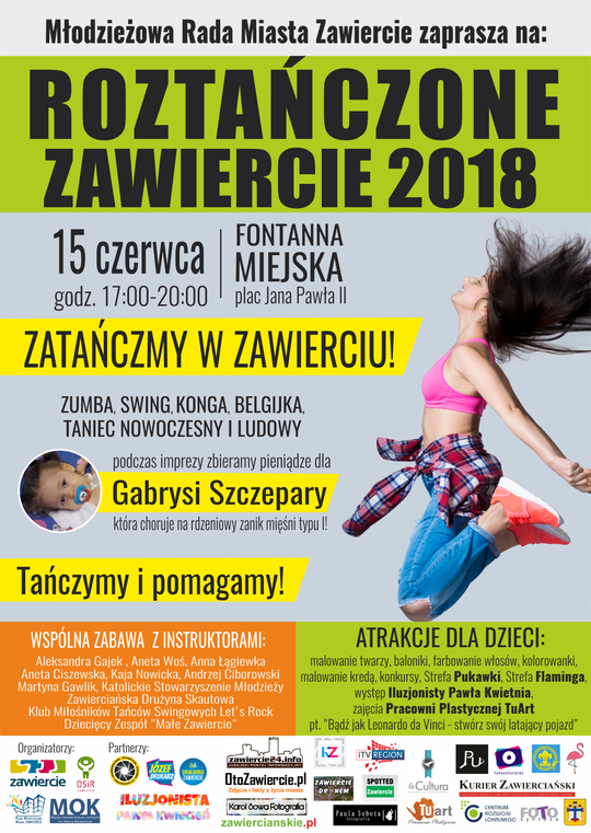Już jutro (w piątek 15 czerwca) przy fontannie na placu Jana Pawła II w Zawierciu spotkają się miłośnicy tańca. Poprzez wspólną zabawę pomogą Gabrysi, chorującej na rdzeniowy zanik mięśni typu I. Oprócz zabawy pod okiem profesjonalnych instruktorów, mieszkańcy mogą liczyć też na inne atrakcje - m.in. konkursy, pokaz iluzji, Strefę Pukawki, Strefę Flaminga, czy też zajęcia Pracowni Plastycznej TuArt.