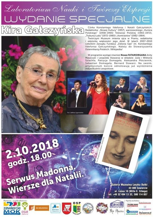 W najbliższy wtorek, 2 października w Galerii Muzealnej Leszka Dutki odbędzie się spotkanie z Kirą Gałczyńską. Przed zawierciańską publicznością wystąpią też młodzi artyści z Nowej Fatamorgany Anity Maszczyk i Leopolda Stawarza.