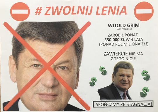 Witold Grim zawiadomił Prokuraturę Rejonową w Zawierciu o prowadzonej przeciwko niemu kampanii oszczerstw. W ostatnich dniach przed I turą (21.10.18) w Zawierciu zaczęły być kolportowane ulotki z jego przekreślonym na czerwono zdjęciem i hasłem „Zwolnij lenia”. Nie wiadomo kto kolportował ulotki, o domysłach nie będziemy pisać, nie mając dowodów. Czy brudna kampania zaszkodzi Grimowi? Prześledźmy „argumenty” hejterów. Przykładowo: „zarobił ponad 550 tysięcy w 4 lata. Nie licząc nagród i premii”. Sprawdziliśmy. Wg oświadczeń majątkowych za 2014-2017 dokładnie 563.070 zł. I co z tego wynika? Właściwie nic. Jego konkurent w II turze, Łukasz Konarski. wg oświadczeń majątkowych za lata 2014-2017 zarobił 354.221 zł. Ale celem ataku jest tylko obecny prezydent Grim. Bez względu na to, kto wygra wybory, będzie zarabiał podobne kwoty rocznie.
