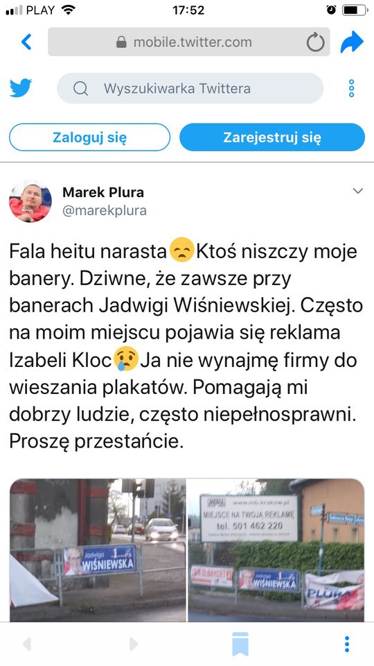 Na pewno coś pominęliśmy, ale warto na koniec wspomnieć o jednym, albo o jednym zjawisku w kilku odsłonach. Poseł Marek Plura, poseł PE z niepełnosprawnością, poruszający się na wózku, na Twitter zaapelował, żeby mu nie niszczyć banerów, zwrócił uwagę, że niszczone są te wiszące obok Jadwigi Wiśniewskiej (PiS). Na FB wywołało to sporą dyskusję, część komentarzy dość złośliwie, choć bez żadnych dowodów wskazywało, komu, lub zwolennikom jakiej partii może przeszkadzać poruszający się na wózku inwalidzkim konkurent… Ktoś przypomniał sprawę Romów na basenie. Ktoś inny, że na tym samym basenie pani Europoseł przeszkadzały „wieśniary, które pozajmowały wszystkie suszarki”. Cytat może nie być dosłowny, ale znaczenie wierne. Nie wiem, co jest w niektórych politykach, ale zupełnie nie chcą się mierzyć z rzeczywistością. A tak łatwo byłoby przyznać się, przeprosić, każdy czasem coś palnie w życiu głupiego. Chyba, że nie „palnął”, a kompromitująca wypowiedź jest jednak odzwierciedleniem poglądów? Wtedy rzeczywiście wykręcić się trudniej i tłumaczyć nie ma czego. Niektórzy -i tu poseł Jadwiga Wiśniewska jako przykład pasuje idealnie- wyraźnie „odlecieli” od rzeczywistości. Rozbawił mnie mem z jej udziałem, jako to pisze na starej maszynie do pisania list od wyborców, ale zapomniała papier do maszyny włożyć. Ten list pewnie nie dojdzie. Inny z czytelników podesłał nam zdjęcie, jak baner z Europoseł wisi na czymś w rodzaju śmietnika. Polska w ruinie, tylko w wydaniu PiS? Czasem nawet żeby wisieć, lepiej dobrze wybrać miejsce. Bo ważne gdzie, i w jakim towarzystwie. Polityka zabić mogą dwie rzeczy: przesada i ośmieszenie. I chyba w obu kategoriach Wiśniewska krąży po granicy.