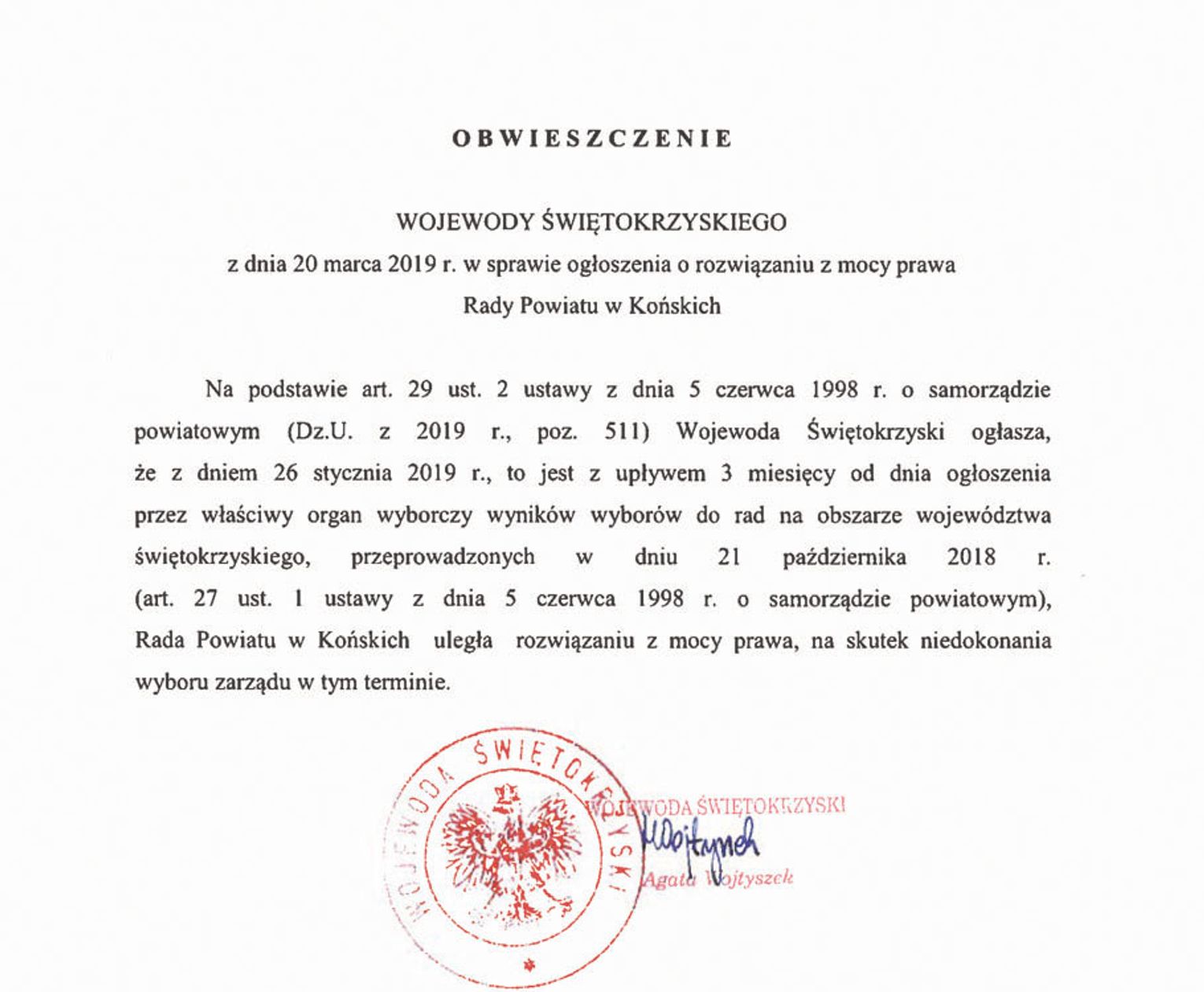 (Zawiercie) Dwa tygodnie temu, dokładnie 15 maja redakcja Kuriera Zawierciańskiego powiadomiła Wojewodę Śląskiego o tym, że wobec rażącego naruszenia prawa, rozwiązaniu ulega Rada Powiatu Zawierciańskiego. Do wojewody należy potwierdzenie naszego zarzutu w formie wydania Obwieszczenia o rozwiązaniu Rady Powiatu Zawierciańskiego z mocy prawa. Publikujemy wzór, wystarczy podmienić nazwę powiatu i nazwisko wojewody. Sytuacja w Zawierciu jest bowiem identyczna jak w powiecie końskim, gdzie Wojewoda Świętokrzyska Agata Wojtyszek 20 marca 2019 rozwiązała Radę Powiatu w Końskich: „Z dniem 26 stycznia 2019, to jest z upływem 3 miesięcy od dnia ogłoszenia przez właściwy organ wyborczy wyników wyborów do rad na obszarze województwa świętokrzyskiego (…) Rada Powiatu w Końskich uległa rozwiązaniu z mocy prawa, na skutek niedokonania wyboru zarządu w tym terminie”.