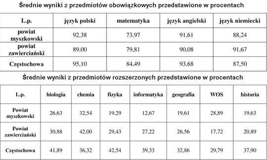 Z najczęściej wybieranych przedmiotów na poziomie rozszerzonym, tj. biologii, chemii, fizyki, informatyki, WOS-u oraz historii najczęściej najwyższe średnie wyniki osiągali uczniowie w Częstochowie, następnie w powiecie zawierciańskim, a na końcu w powiecie myszkowskim.