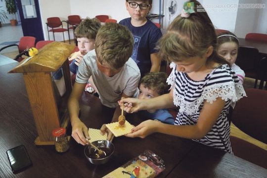Następnie dzieciaki brały udział w spotkaniu Wszystko o pszczołach, podczas którego porozmawiały z lokalnymi pszczelarzami. Panowie Adam Kordas i Henryk Urbańczyk opisali uczestnikom warsztatów, jak wygląda życie pszczół na co dzień. Prowadzący podkreślili również, że 1/3 spożywanego przez ludzi pokarmu, zależy od tych owadów. Owoce, warzywa i produkty, które są z nich wytwarzane i stosowane każdego dnia, jak bawełna czy różnego rodzaju oleje, są efektem zapylania.