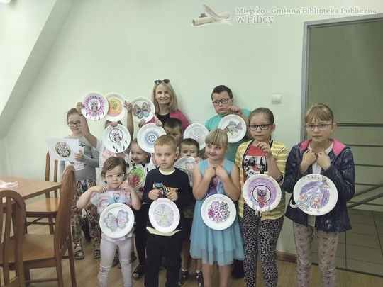 Dzieci spotkały się w Miejsko-Gminnej Bibliotece Publicznej w Pilicy w czwartkowe przedpołudnie, 18 lipca. Tego dnia zajmowały się tworzeniem barwnych ozdób. Wykończone zostały mandalami – rysunkami na planie koła. Wywodzi się z kultury hinduskiej, a tworzenie mandali uważa się za relaksującą i wyciszającą, ale również za zajęcie rozwijające wyobraźnię. Mandale skutecznie zajęły uwagę dzieci.