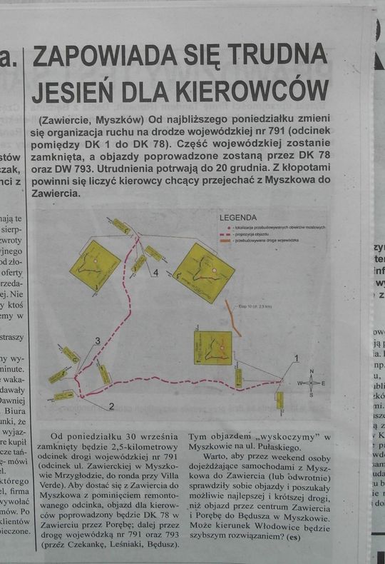 Jak możecie Państwo przeczytać w dzisiejszym wydaniu obu tygodników, w najbliższy poniedziałek (30.09) miała zostać zamknięta droga wojewódzka nr 791 między Myszkowem a Zawierciem (2,5-kilometrowy odcinek ul. Zawierckiej pomiędzy Mrzygłodem a rondem przy Villa Verde). Objazd wytyczono przez Porębę, a droga miała być zamknięta aż do 20 grudnia.