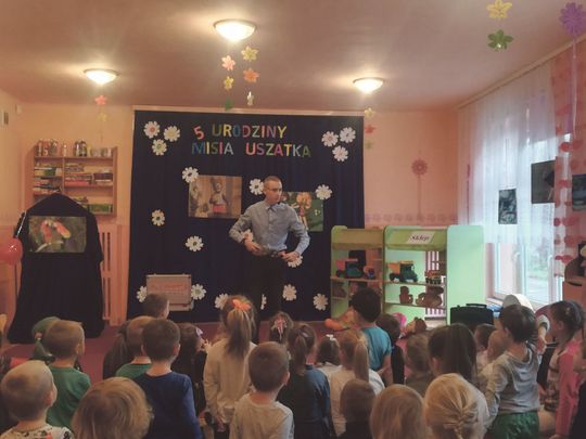 Z okazji urodzin Misia Uszatka dzieci odwiedził wyjątkowy gość – iluzjonista Paweł Kwiecień. Zabrał on najmłodszych do świata magii i czarów. Przedszkolaki aktywnie brały udział w pokazie. Ochotnicy, którzy wykazali się odwagą i śmiałością, pomagali iluzjoniście i same czarowały. Dzieci były bardzo zadowolone, przypadły im do gustu prezentowane przez Pawła Kwietnia sztuczki. Spotkanie z wyjątkowym gościem pełne było radości i humoru.