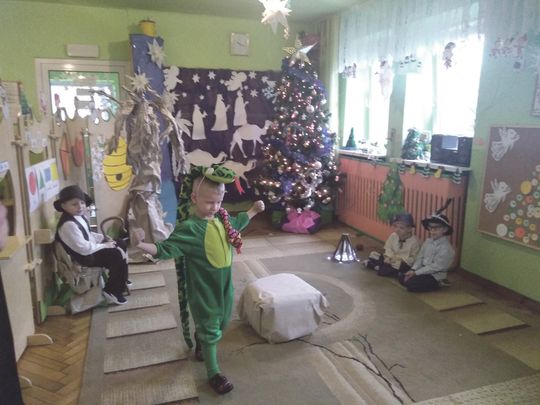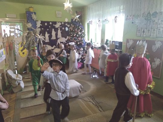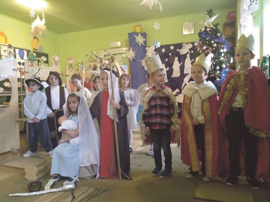 Pszczółki wystawiły Jasełka w formie pantomimy. Przedstawienie pokazywało czasY od Adama i Ewy do czasów narodzin Jezusa Chrystusa. Mali aktorzy, we wspaniałych strojach prezentowali się doskonale na tle bożonarodzeniowej dekoracji. Wszyscy ulegli magii występów przedszkolaków. Dzieci z dużym przejęciem i zaangażowaniem odtwarzały swoje role, prezentując imponujące umiejętności. Kolejny raz okazało się, że takie wspólne spotkania, emocje i przeżycia zbliżają ludzi, a dzieciom pokazują jak ważna jest tradycja świąt Bożego Narodzenia i jak bardzo rodzinne jest to święto. Nie zabrakło oczywiście prezentów dla Dzieci i Rodziców, które znalazły się pod choinką. (es)