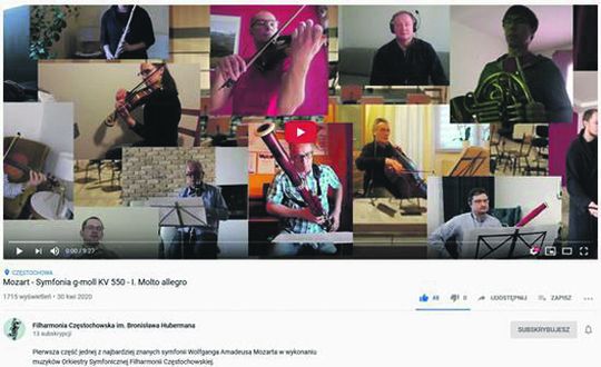 „Szanowni Państwo, ponieważ ze względu na epidemię musimy pozostawać w domach i pracujemy indywidualnie, chcielibyśmy umilić Państwu czas, pokazać że pracujemy, ćwiczymy, że Filharmonia Częstochowska działa. I chcieliśmy zaprosić Państwa – w tym nieco mniejszym, kameralnym składzie do wysłuchania I części słynnej Symfonii g-moll KV 550 Wolfganga Amadeusa Mozarta, z której każdy z nas swoją partię nagrał osobno, w swoim domu. Materiał został scalony i chcielibyśmy Państwu przedstawić naszą pracę wspólną, ale jednocześnie osobną.”