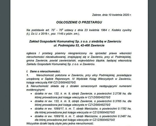Ewa Mićka mówiła o ogłoszeniu o przetargu, jakie opublikował Zakład Gospodarki Komunalnej. 10 kwietnia ogłoszono przetarg na sprzedaż działek, które na początku roku Zakładowi przekazało miasto. Miały być przeznaczone na cele rozwojowe ZGK. Jak mówiła radna Mićka, do 15 kwietnia był czas na wpłatę wadium. W dodatku był to okres świąteczny. Przetarg unieważniono 30 kwietnia, ale bez podania przyczyny. Radna zastanawiała się, czy unieważnienie mogło mieć związek z szumem, jaki wywołały kosze na śmieci z naklejkami COVID-19. - Cena też jest zastanawiająca jeśli chodzi o te działki, bo tam są działki przeznaczone na przetwarzanie odpadów, więc są to drogie działki. Nie rozumiem czemu ZGK je sprzedaje, skoro im je przekazaliśmy, żeby mogło się rozwijać – mówiła Ewa Mićka.