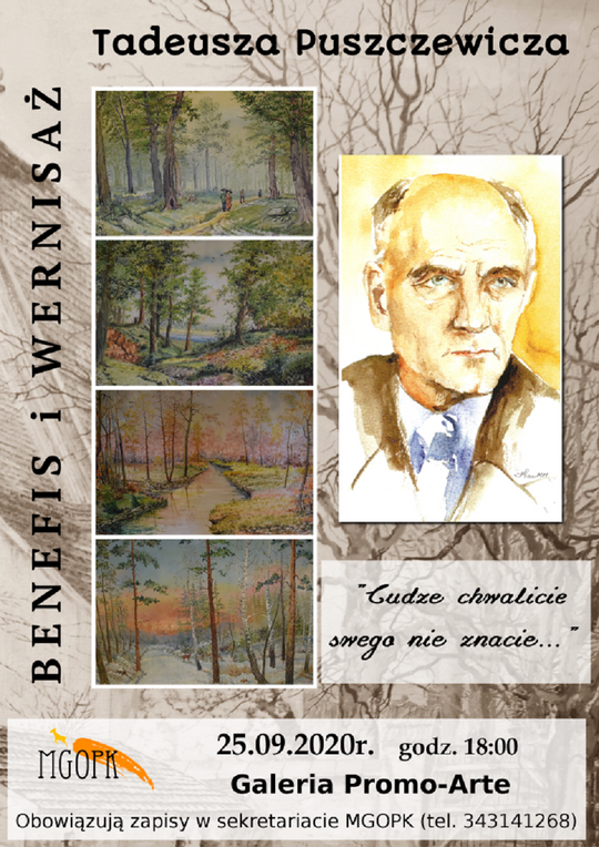 O godzinie 18 Galerii Promo Arte Miejsko-Gminnego Ośrodka Promocji Kultury w Koziegłowach odbędzie się wystawa prac znanego koziegłowskiego malarza i plastyka Tadeusza Puszczewicza zatytułowana „Cudze chwalicie swego nie znacie”. Wydarzenie będzie obejmowało wernisaż prac artysty oraz benefis podczas którego Tadeusz Puszczewicz będzie opowiadał o swojej twórczości.