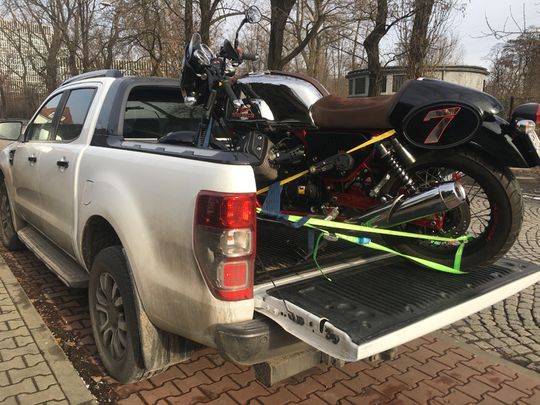 Podciągnięty w górę niemal jednym palcem motocykl zostało już tylko postawić na pace pick-up-a. Manewrując delikatnie można to zrobić zupełnie w pojedynkę. Później zostało już tylko ciągle wiszący na łańcuchu motocykl delikatnie opuścić i przymocować. Na pick-up-e punktów mocowania nie brakuje, więc sprawa jest prosta i bezpieczna. Wypróbowałem zarówno transport idealnie na wprost jak i po skosie z przednim kołem wciśniętym w róg paki. Drugi miał ten urok, że motocykl odebrany z serwisu, dodatkowo pięknie wyczyszczony, okazale się prezentował we wstecznym lusterku…