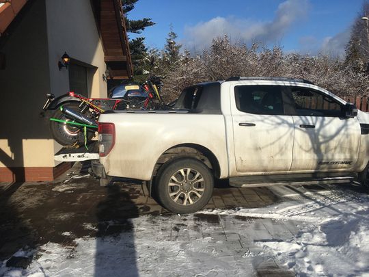 W pick-up-e z podwójną kabiną /u mnie: Ford Ranger/ mamy ok. 180 cm długości dla motocykla ustawionego równo na wprost, i ok. 200 cm w poprzek. Mogłoby być nawet więcej, ale jak większość użytkowników pickupa mój wyposażony jest w zwijaną roletę, więc jej skrzynia ogranicza nieco maksymalną długość przestrzeni bagażowej. Jak by nie liczyć, zmieści się nawet najdłuższy motocykl. Nowy Triumph Rocket III ma np. rozstaw osi 1677mm. Można jeszcze wykorzystać podstawkę pod przednie koło, albo ustawić moto w całości na szynie z podpórkami do przewozu motocykla jak busie lub przyczepie, ale to już raczej detale w rozwoju transportu motocykla na pick-up-e. Szyna może mieć sens przy przewozie najdłuższych i najcięższych motocykli. Ułatwi nieco załadunek i zmniejszy obciążenie klapy przestrzeni bagażowej.