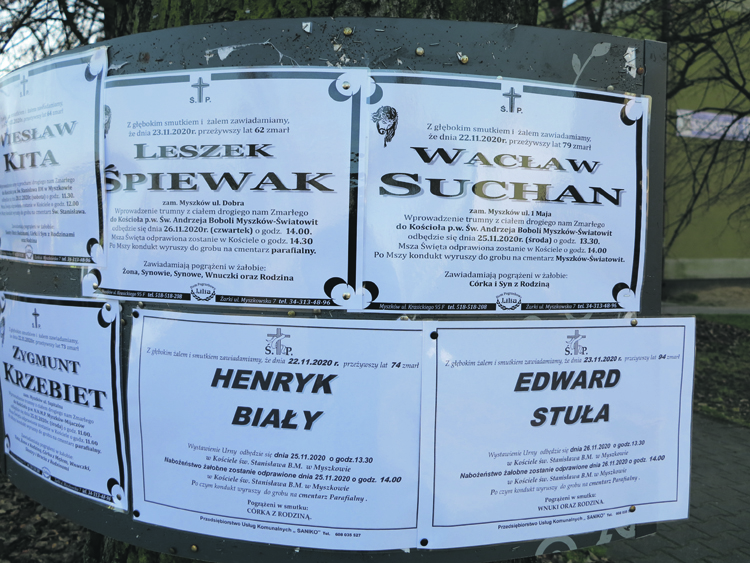 Jak wynika z danych dotyczących sytuacji epidemiologicznej SARS-CoV-2, które jeszcze do niedawna publikowała Powiatowa Stacja Sanitarno-Epidemiologiczna w Zawierciu, w październiku 2020r. odnotowano 5 zgonów. Ale Sanepid odnotowuje tylko te zgodny, gdzie śmierć nastąpiła bezpośrednio, lub w związku z zachorowaniem na Covid-19.