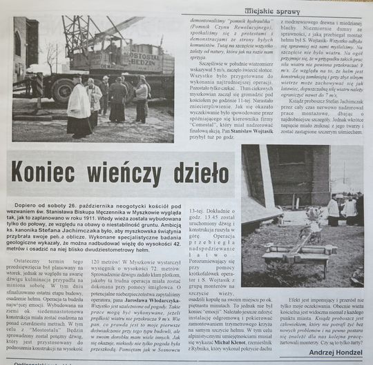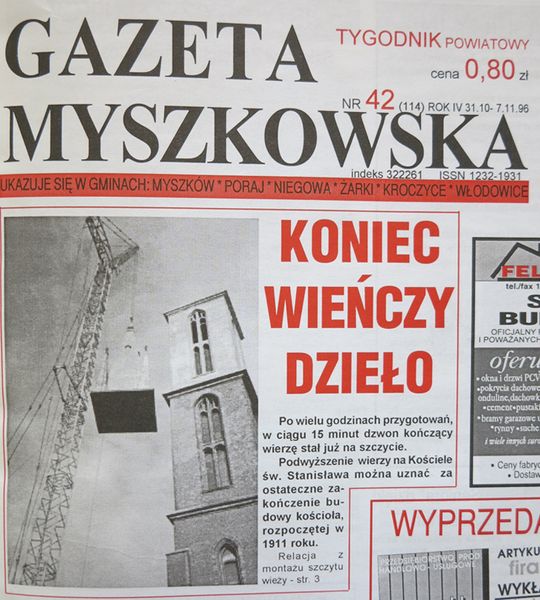 Ksiądz Stefan Jachimczak w naszej pamięci zostanie zapamiętamy przede wszystkim jako odważny człowiek, który podjął się trudnego dzieła podwyższenia wieży kościoła, zgodnie z pierwotnym projektem kościoła neobarokowego. Ta odważna decyzja ks. Stefana Jachimczaka, zrealizowana w 1996 roku, na stałe zmieniła na lepsze architekturę Myszkowa. Pisaliśmy o tych wydarzeniach w 1996 roku, gdy dzieło było ukończone i wcześniej. Wkrótce postaramy się na łamach GM przypomnieć tamte chwile.