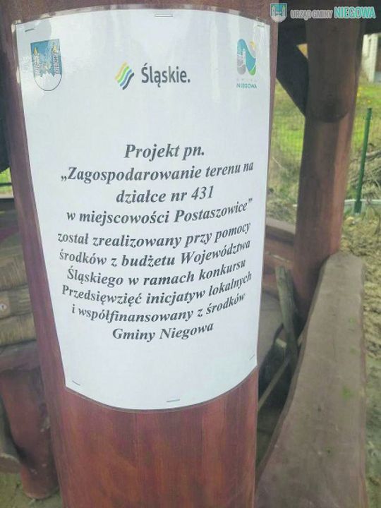 Na terenie działki nr 431 w Postaszowicach (gm. Niegowa) pojawiły się urządzenia zabawowe i siłowe oraz oświetlenie. Powstał chodnik i wykonano nasadzenia zieleni, zasiano trawę i ogrodzono plac. Prócz tego wyrównano teren i zakupiono rurę odwadniającą, w celu zabezpieczenia zbiornika.