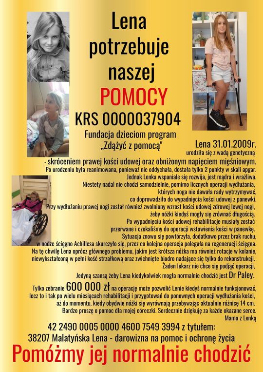 Na wsparcie Lenki zostało założone kilka zbiórek publicznych, które weryfikują prawdziwość celu zbiórki. Choć akcja pomocy dla Lenki trwa od końca września i nie była dotychczas szeroko nagłaśniana, udało się zebrać ponad 60 tysięcy. Na pierwszy zabieg -jak mówi nam ciocia Leny Malatyńskiej, Natalia Buczyńska, potrzeba około 340 tysięcy złotych: -Oprócz zbiórek pieniężnych rozkręcamy wszystkie sposoby na zbieranie funduszy na leczenie Lenki. Wspólnie z szafowanie.pl będziemy organizować zbiórkę odzieży. Za kg otrzymamy 70 groszy, czyli tona takiej zebranej odzieży to już 700 zł. Dlatego prosimy nie wyrzucać ubrać do śmietników, gromadzić je na razie w domach, a wkrótce ogłosimy gdzie można odzież przekazać.