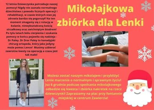 Włączenie się do pomocy zbieraniu pieniędzy na operację Lenki włączyła się grupa Osiedle Żabki Zawiercie (FB), która 6 grudnia 2021 w Mikołajki będzie zbierała nakrętki, będzie też można wrzucać pieniądze do puszek. Miejsce: fontanna miejska w Zawierciu.