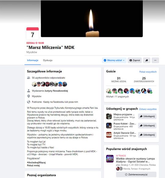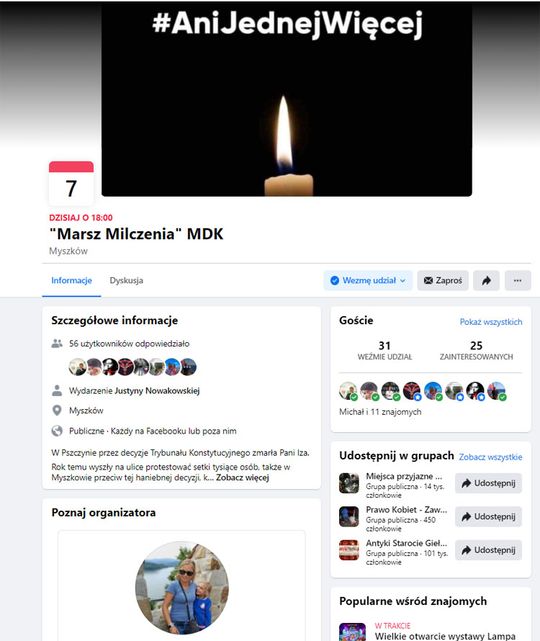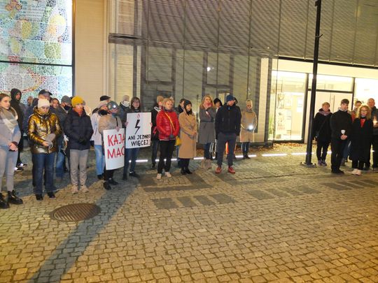 6 listopada w Polsce odbyły się marsze i demonstracje pod hasłem AniJednejWięcej w Warszawie i dziesiątkach innych miast, miasteczek. 7 XI rano, na portalu społecznościowym pojawił się apel myszkowianki Justyny Nowakowskiej, aby o godz. 18:00 spotkać się pod MDK i przejść w marszu milczenia ulicą 3 Maja, przez Plac Dworcowy, obok Urzędu Miasta. Przyszło około 150 osób. Niemało, choć z pewnością protest były o wiele liczniejszy, gdyby decyzja o tym, że również w Myszkowie taki protest się odbędzie, zapadła wcześniej.