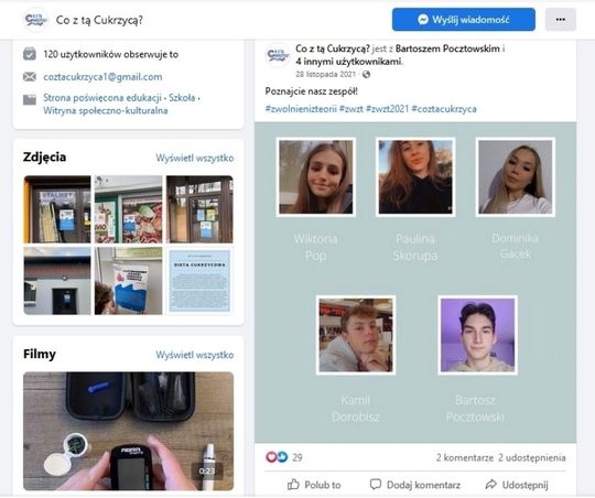- Nasz zespół w ramach realizacji projektu działa w mediach społecznościowych, publikujemy posty edukacyjne na temat cukrzycy, przepisy dla diabetyków, przedstawiamy jaka jest zawartość cukru w popularnych produktach. Na naszym Instagramie, Facebooku, Tik Toku, Twitterze czy stronie internetowej można znaleźć bardzo dużo ciekawostek oraz informacji o tym jakie są objawy, przyczyny i powikłania cukrzycy. Pokazaliśmy też jak wygląda prawidłowy pomiar cukru – wylicza Wiktoria Pop.