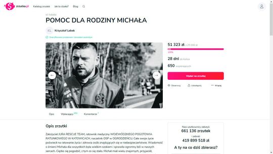 - Założyciel JURA RESCUE TEAM, ratownik medyczny WOJEWÓDZKIEGO POGOTOWIA RATUNKOWEGO W KATOWICACH, naczelnik OSP w OGRODZIEŃCU. Całe swoje życie poświecił na ratowanie życia i zdrowia osób znajdujących się w niebezpieczeństwie. Wiadomość o śmierci Michała dla wszystkich była wielkim szokiem i sprawiła ogromny ból w naszych sercach. Ciężko się pogodzić, z tym co się stało. Michał miał wielu znajomych, przyjaciół, kolegów ale poza nimi w domu miał dwie ukochane dziewczyny Oliwię i 2-letnią Zuzię, które były jego całym światem. O córeczce Zuzi opowiadał każdego dnia, czy to w pracy czy przy prywatnych spotkaniach, pokazywał zdjęcia, filmy na których razem z małą odkrywali świat. W chwilach wolnych od pracy były wycieczki, zabawy i wygłupy, którym nie było końca. Nie chcemy, żeby teraz dziewczyny zostały same, bez pomocy, bez wsparcia. Michał będąc ratownikiem niósł pomoc każdego dnia. Ciężko byłoby zliczyć ile osób zostało przez niego uratowanych. Teraz my bądźmy ratownikami i pomóżmy rodzinie Michała. Zapraszamy wszystkich, którzy maja ochotę wesprzeć rodzinę naszego wspólnika, przyjaciela, Najlepszego Taty Zuzi, ratownika medycznego, naczelnika OSP. Wielu z Was prosiło, aby zorganizować zbiórkę na ten cel dlatego JURA RESCUE TEAM przy poparciu WOJEWÓDZKIEGO POGOTOWIA RATUNKOWEGO w KATOWICACH oraz OCHOTNICZEJ STRAŻY POŻARNEJ w OGRODZIEŃCU utworzyła tę zrzutkę.