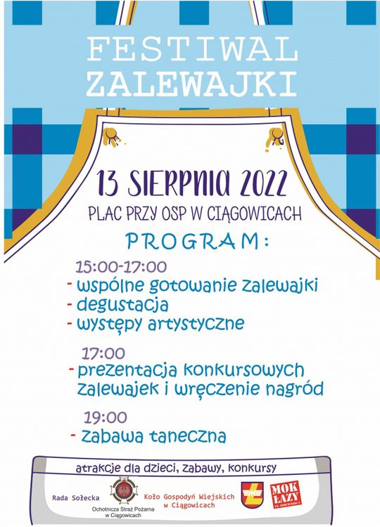 13 sierpnia 2022r. w Ciągowicach przy Ochotniczej Straży Pożarnej odbędzie się „Festiwal Zalewajki”, którego organizatorami są: Rada Sołecka Sołectwa Ciągowice, Koło Gospodyń Wiejskich w Ciągowicach oraz Ochotnicza Straż Pożarna w Ciągowicach.