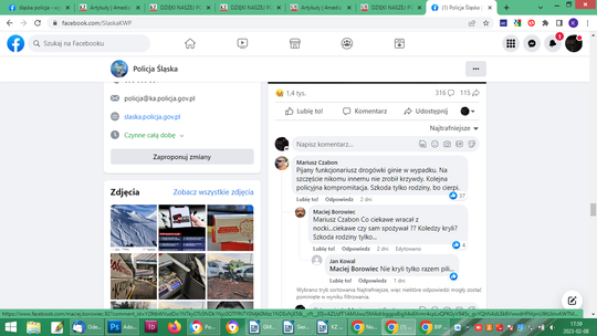 „Zasada, a zasad się nie trzymał, był napruty jak wieprz. Brawo Policja . Gostek z ruchu drogowego co z alkomatem po skrzyżowaniach biegał. Hańba.”