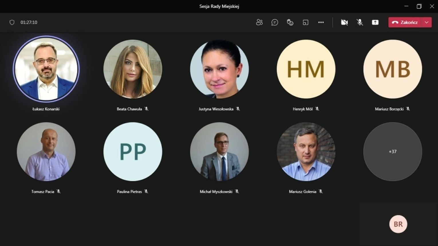 Po sprawdzeniu obecności zapadła cisza. Przewodnicząca ogłosiła, że nie ma kworum i zarządza 10 minut przerwy. Po jej zakończeniu, Justyna Wesołowska poinformowała, że w związku z dołączeniem jednego radnego jeszcze raz sprawdzi obecność. Połączył się Jerzy Radosz, dzięki czemu obecnych było w sumie 11 radnych i ponownie udało się zebrać kworum.