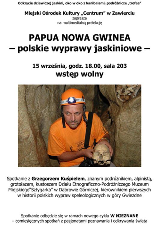 (Zawiercie) Już 15 września w ramach cyklu „W nieznane” w zawierciańskim MOK „Centrum” odbędzie się spotkanie z Grzegorzem Kuśpielem. Podróżnik, grotołaz, instruktor alpinizmu opowie o świecie ciemnych jaskiń, swoich górskich przygodach i o tym jak wpadł na pomysł pierwszej polskiej speleologicznej wyprawy do Papui Nowej Gwinei. Początek spotkania o 18.00 w sali 203. (mpp)