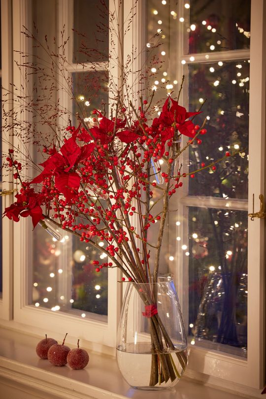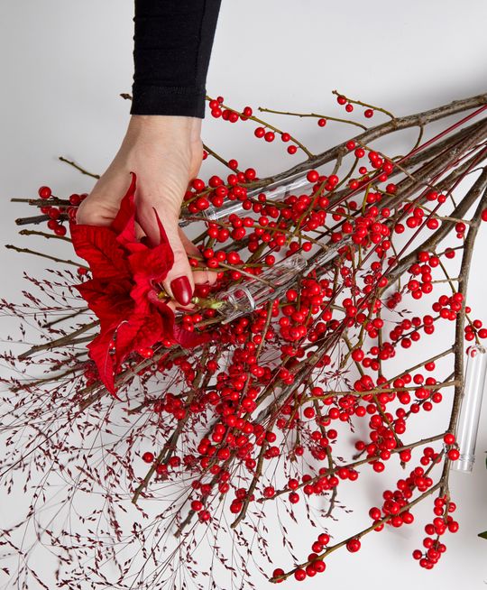 Oto jak to zrobić: przymocuj probówki do łodyg ostrokrzewu za pomocą drutu rzemieślniczego a następnie uformuj z nich i traw bukiet, który przewiąż czerwoną wstążką. Napełnij probówki wodą, włóż ciętą poinsecję i umieść kompozycję w wazonie z wodą.