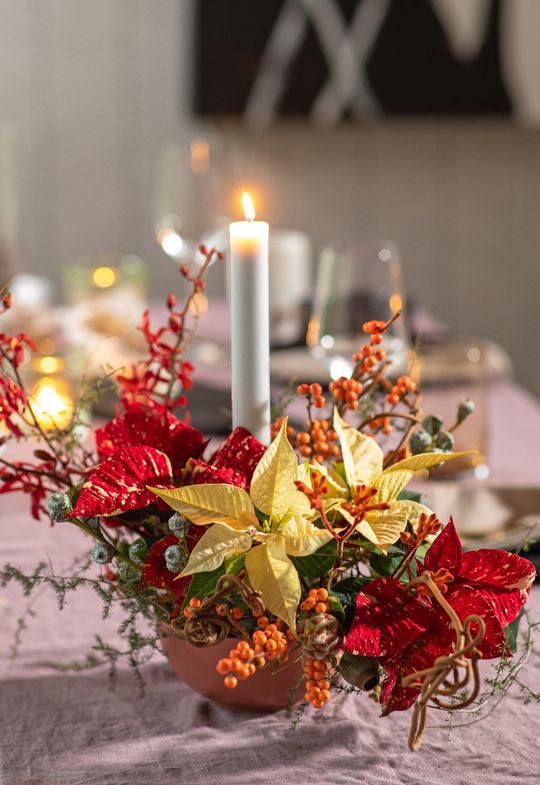Nowoczesna ozdoba świątecznego stołu. W tej eleganckiej aranżacji w stylu skandynawskim, kremowe poinsecje cudownie odbijają się w blasku świec. Ta artystyczna kompozycja w ciepłych, jesiennych odcieniach nie wymaga wielkich umiejętności.