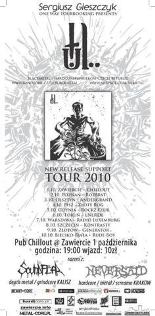(Zawiercie) 1 października (piątek) o godzinie 19.00 w pubie Chillout odbędzie się kolejny koncert w klimatach metalowych. Gwiazdą tego wieczoru będzie czeska kapela -!úl… (hardcore/punk/black metal), supportować ją będzie skład z Kalisza Soundfear (death metal/grindcore) oraz krakowski The Neversaid (hardcore/metal/screamo).