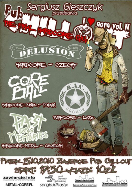 Delusion to legenda czeskiego hc/punka. Na scenie naszych sąsiadów z południa istnieją od 1995 roku. Mają na koncie jedynie trzy wydawnictwa i ponad 250 koncertów na południu Europy m.in. wraz z Hatebreedem czy Deadlockiem. Serwują porządną dawkę mocnego a zarazem melodyjnego uderzenia. Przed Czechami swój popis dadzą: Core Ball prezentujący punkowe oblicze Torunia. Charakteryzuje ich świetny wokal, którego może pozazdrościć niejedna kapela oraz granie na najwyższym poziomie. PAST DAY MEMORIES – młody oświęcimski skład, którego muzykę można zaliczyć do szeroko pojętej kategorii metalcoru. Chłopaki nie pozostają wierni tylko temu gatunkowi, inspirują się także nieco innymi nurtami. Tego wieczoru zagra również debiutująca punkcorowa kapela z Łaz - K.A.C Escape. Jest to ostatni hadcorowy koncert w Chilloucie w tym roku kalendarzowym. Nie oznacza to jednak, że nie będzie żadnych innych imprez ani koncertów. Dobrą wiadomością dla fanów hardcoru jest to, że w nowym roku Frontside zagra ponownie w Zawierciu – w drugiej części trasy pod nazwą „Zniszczyć Wszystko” promującą nowy krążek, który zostanie wydany w listopadzie tego roku. Serdecznie zapraszamy na piątkowy koncert! (axa)