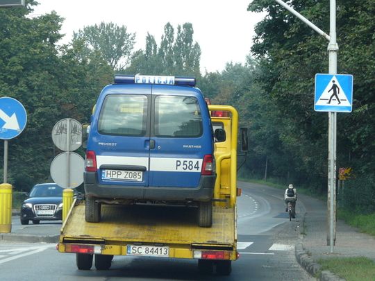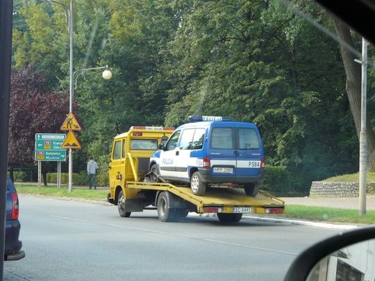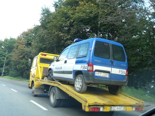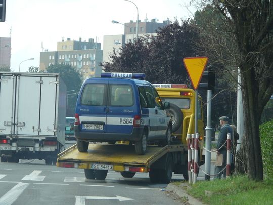 Sytuacja w tym momencie jest o tyle nietypowa, że posłuszeństwa odmówił pojazd służb mundurowych, które to wśród swoich obowiązków mają m.in. sprawdzanie sprawności technicznej naszych pojazdów. Tym razem to jednak niesprawny radiowóz musiał zostać odholowany. Odjechał zatem, też trochę jak w przysłowiu. Przysłowiu o łasce pańskiej, która na pstrym koniu jeździ. Pstrego konia zastąpiła tym razem żółta laweta. No chyba, że jest to nowy policyjny sposób… oszczędzania na paliwie. (rb)