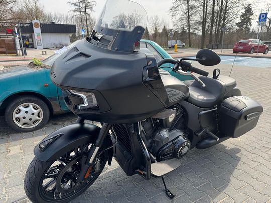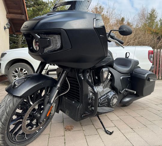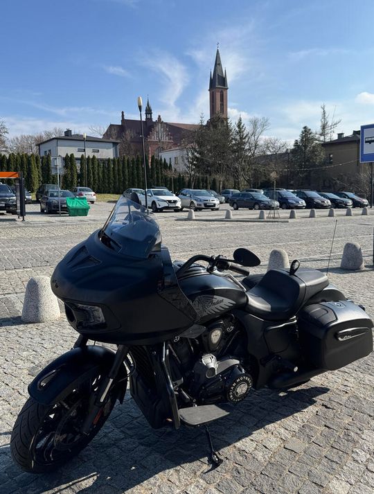 Indian Challenger, na silniku o pojemności 1768 ccm dumnie nosi napis SINCE 1901. Tak głęboko w przeszłość sięga rodowód kultowej, choć mniej popularnej niż ich amerykański konkurent marki motocykli. Podstawowe, imponujące dane Indian Challenger jaki testowaliśmy w wersji Dark House: 122 kM, maksymalny moment obrotowy 178 NM osiągany już przy 3800 obrotach. Masa własna 381 kg.