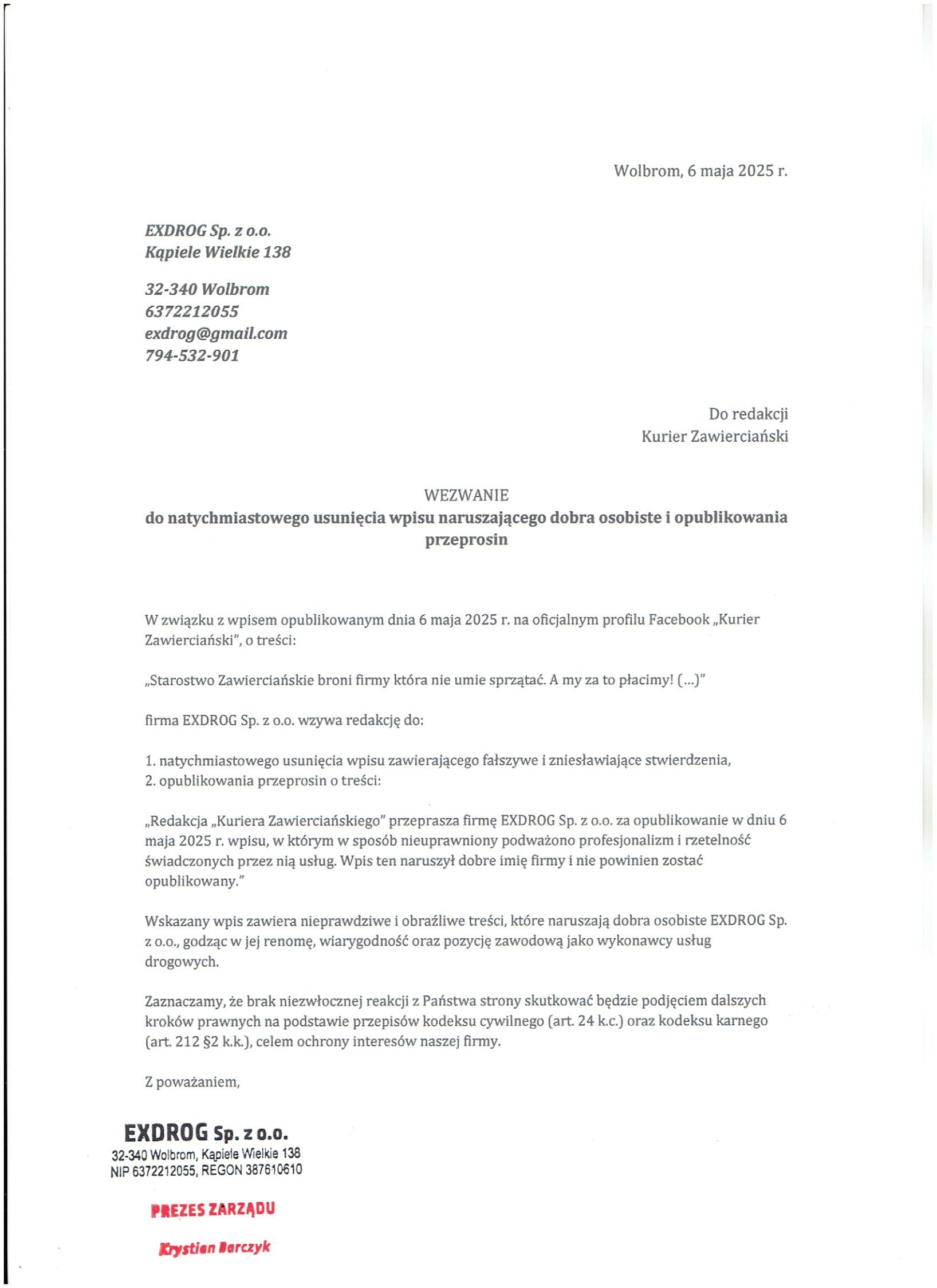 Z uwagi na bezpodstawne i zniesławiające sformułowania podważające profesjonalizm EXDROG Sp. z o.o., domagamy się natychmiastowego usunięcia wskazanego wpisu oraz publikacji przeprosin w określonej formie. Brak reakcji z Państwa strony w terminie 3 dni od daty doręczenia niniejszego wezwania spowoduje podjęcie odpowiednich kroków prawnych- z poważaniem, Krystian Barczyk Prezes Zarządu EXDROG Sp. z o.o. 794-532-901 [email protected]