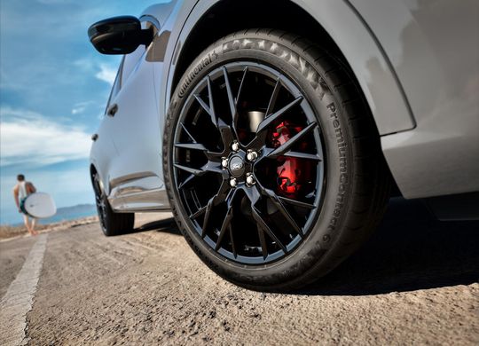 Wśród przyciemnionych elementów pakietu znalazły się 20-calowe felgi aluminiowe Ford Performance – odważny, sportowy akcent, uzupełniający elegancki, muskularny design Kugi. Felgi kontrastują ze standardowymi, malowanymi w kolorze czerwonym zaciskami hamulcowymi.