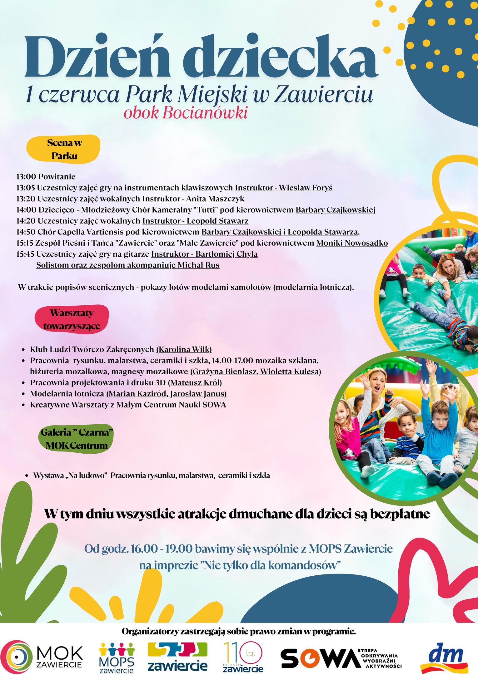 Dzieci i młodzież MOK Zawiercie zaprasza na Dzień Dziecka. Darmowych atrakcji nie zabraknie! Gdzie i kiedy piszemy na plakacie. W wszystko w niedzielę 1 czerwca w Parku Miejskim.