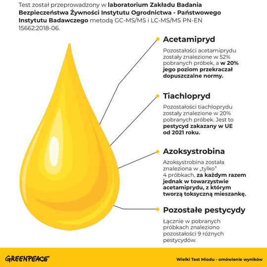 W co piątej próbce badacze znaleźli tiachlopryd, którego używanie jest zakazane od lutego 2021 roku. Z kolei w 10 próbkach przekroczony był poziom dopuszczalnej zawartości substancji toksycznej.