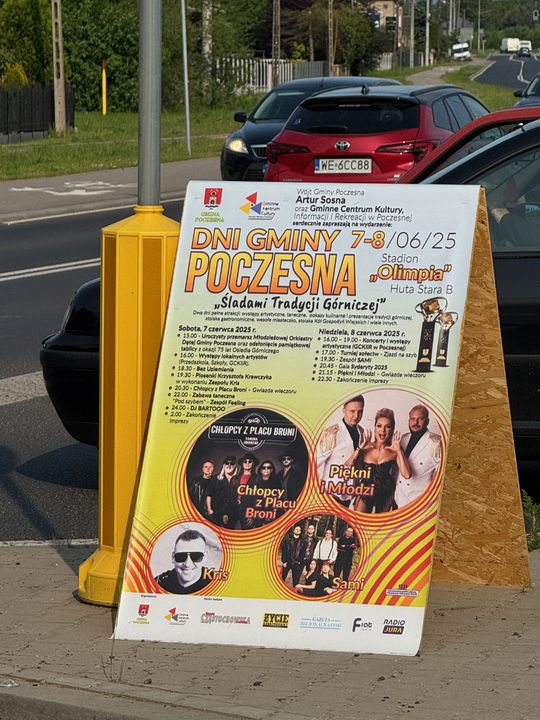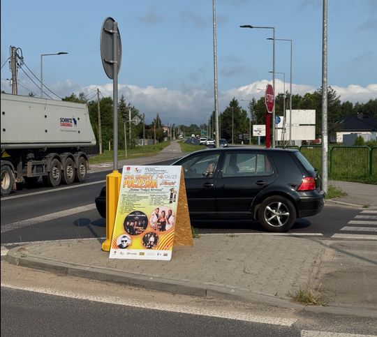 Teraz wójt Poczesnej ponownie negatywnie zaskoczył. Na środku skrzyżowania jadąc od urzędu Gminy Poczesna do Kolonii Borek mamy tablicę reklamującą Dni Poczesnej. Już w ten weekend 7-8 czerwca. Tablica z programem święta całkowicie zasłania widok, możliwość obserwacji Drogi Wojewódzkiej, samochodów jadących od Poraja. Możliwość obserwacji mają tylko ciężarówki, i wysokie SUVy.