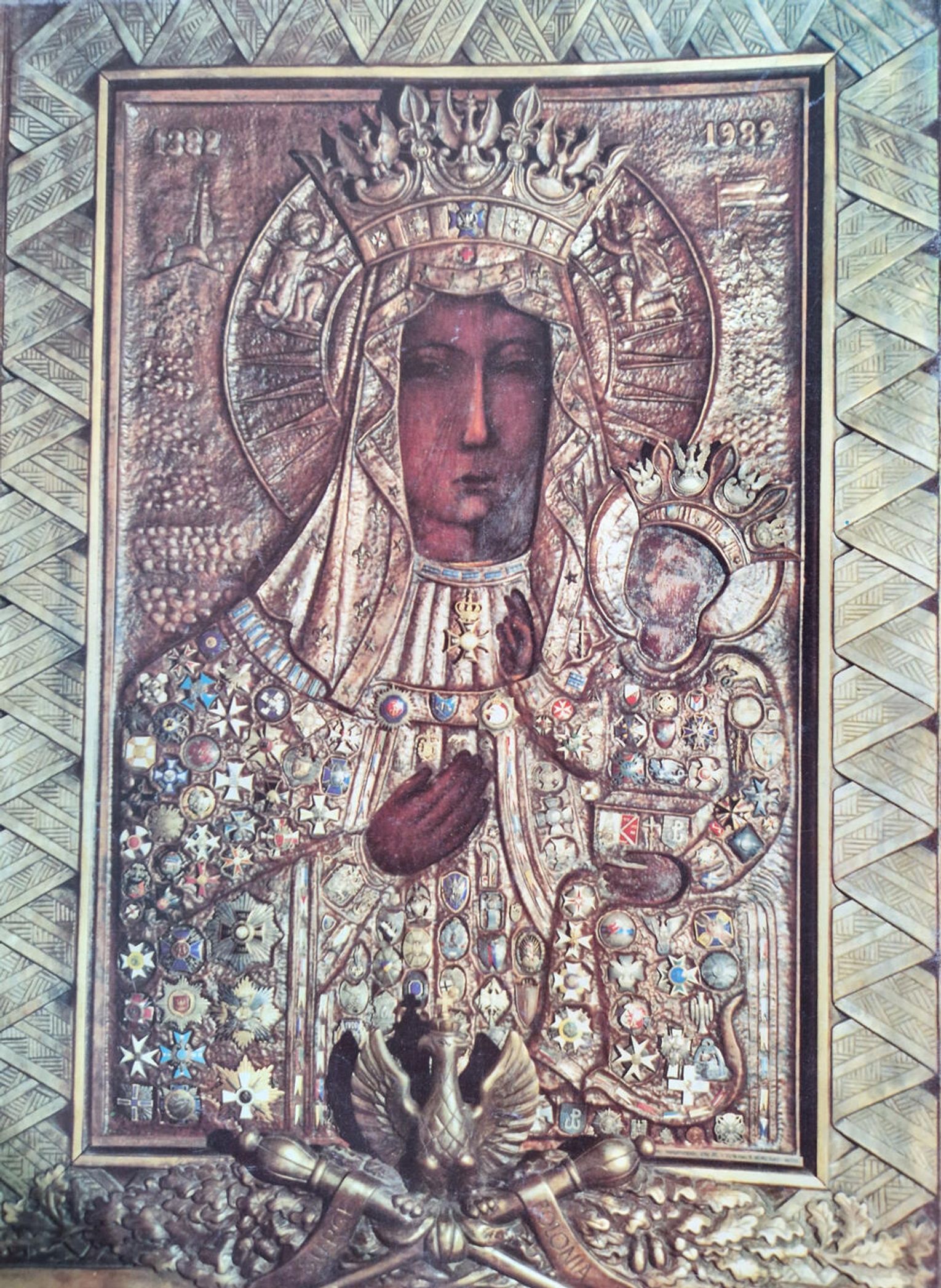 Obraz został umieszczony w Arsenale na Jasnej Górze. Tło obrazu przedstawia historyczną defiladę rycerstwa polskiego. W lewym, rogu u góry widnieje data „1382”, a poniżej sylwetka klasztoru. Od niego, aż po płaszcz Matki Bożej , który jest kuty z miedzianej blachy, ciągną szeregi żołnierzy.