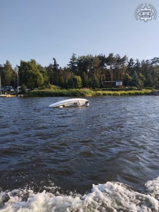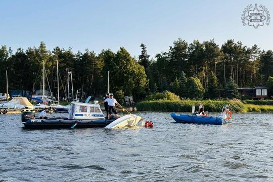 Patrol w składzie sierż. Łukasz Maliszkiewicz i st. post. Dawid Mazurek niezwłocznie udali się na miejsce zdarzenia. Zobaczyli i przewróconą żaglówkę, przy której w wodzie były 3 osoby, a przy jednej z nich był też pies, który z asekuracją właściciela utrzymywał się na kamizelce ratunkowej na powierzchni wody.