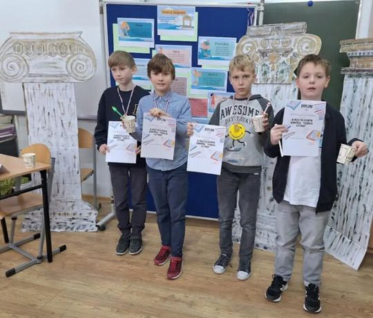 Cykl lekcji poświęconych mitologii greckiej prowadzony metodami aktywizujacymi połączył uczniów we wspólnej zabawie i pracy, rozbudził ich wyobraźnię, wykształcił umiejętność samokształcenia i pracy w grupie. Uczniowie klas 4 i 5 wzięli udział w konkursie pięknego czytania mitów o Tezeuszu oraz Dedalu i Ikarze. Wyłoniono zwycięzców, którzy otrzymali nagrody książkowe. Uczniowie kl. 5 na lekcjach języka polskiego poznali świat greckich bogów w oparciu o metodę dramy. Poprzez wejście w rolę mitologicznych bogów dzięki strojom, wykonanym samodzielnie i z pomocą rodziców, stworzeniu atrybutów, prezentacji własnej osoby jako greckiego boga odkryli własne możliwości, talenty i umiejętności artystyczne. Poznali również związki frazeologiczne związane z mitologią, wykonując ich rysunkowe interpretacje. Uczniowie kl. 5 i 6 na informatyce przygotowali teksty informacyjne na temat Grecji, jej kultury, sztuki czy położenia geograficznego. Uczniowie kl.5 na lekcji angielskiego doskonalili sprawność słuchania ze zrozumieniem, utrwalając w ten sposób wiadomości na temat Grecji. Podczas zajęć techniki dzieci wykonały atrybuty bogów. Na lekcjach muzyki natomiast uczniowie zapoznali się z przykładami utworów muzyki klasycznej zainspirowanych mitologią.