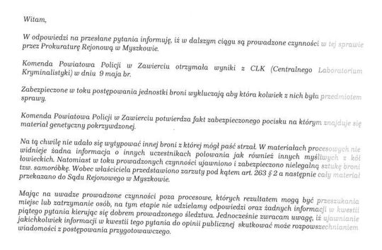 Anonim z KPP Zawiercie odpowiada: „Na tę chwilę nie udało się wytypować innej broni z której mógł paść strzał. W materiałach procesowych nie widnieje żadna informacja o innych uczestnikach polowania jak również innych myśliwych z kół łowieckich. Natomiast w toku prowadzonych czynności ujawniono i zabezpieczono nielegalną sztukę broni, tzw. „samoróbkę”. Wobec właściciela przedstawiono zarzuty pod kątem art. 263 par. 2 a następnie cały materiał przekazano do Sądu Rejonowego w Myszkowie.”